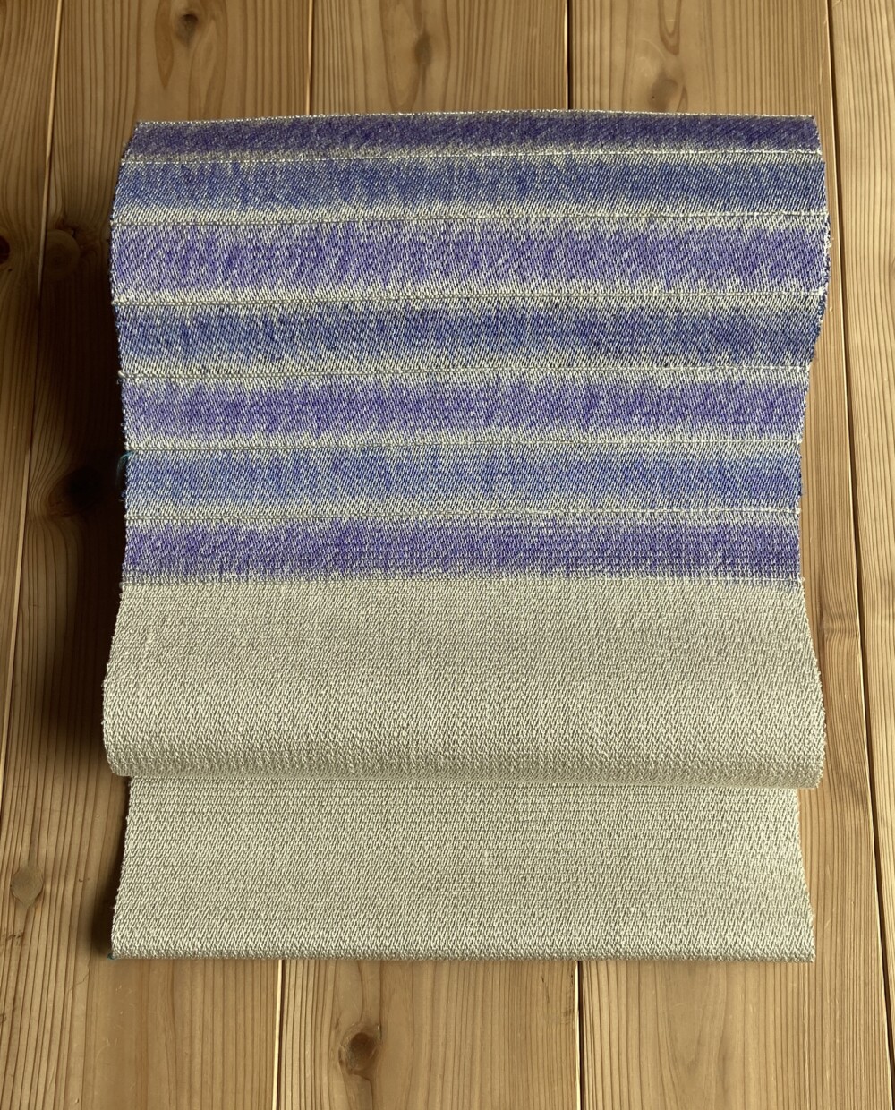 グレーから白へ向かうところは、静かなグラデーション。橙色の銀糸をアクセントに入れてます。