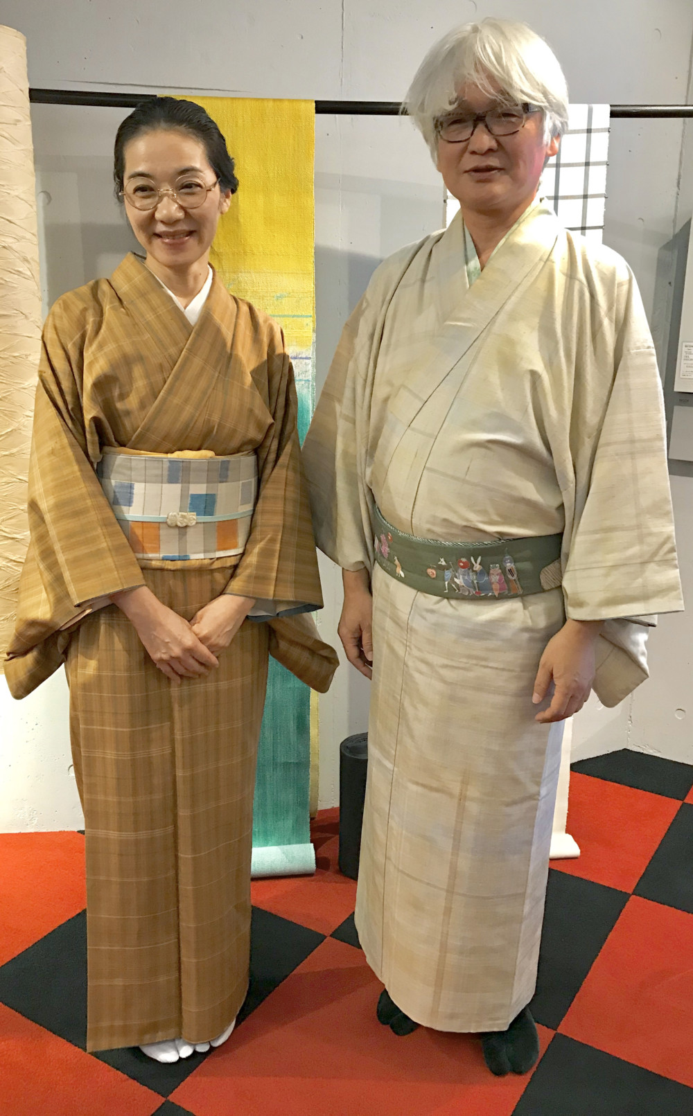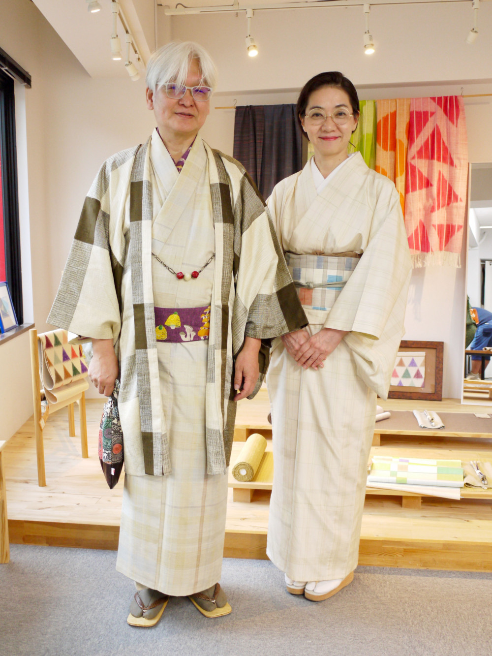 ほぅ、お洒落ですね〜。こちらの男性。お召しのお着物は、女性ものの絵羽のきものとして織ったものです。しかし、パッと見て、「これ私いいかも?」とおっしゃって、お召し下さることになったんです。でね、どこに着て行っても、褒められるのですって!
